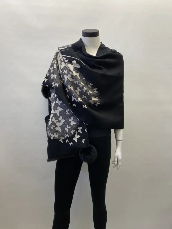 Mitchie’s Matchings produces a wide range of products using only genuine furs: mink, fox, shaved beaver, chinchilla, coyote and rabbit, all dyed in a variety of fashionable colors. Whatever your style, personality, career or mood, Mitchie accessories are designed for you. You can be “matched” from head to toe with our complete range of products. When the temperature drops, be ready to snuggle up in cozy, trendy or classic fur accessories from “Mitchie’s”. – Reversible scarf with butterflies and fox pompons. This item is available in black
